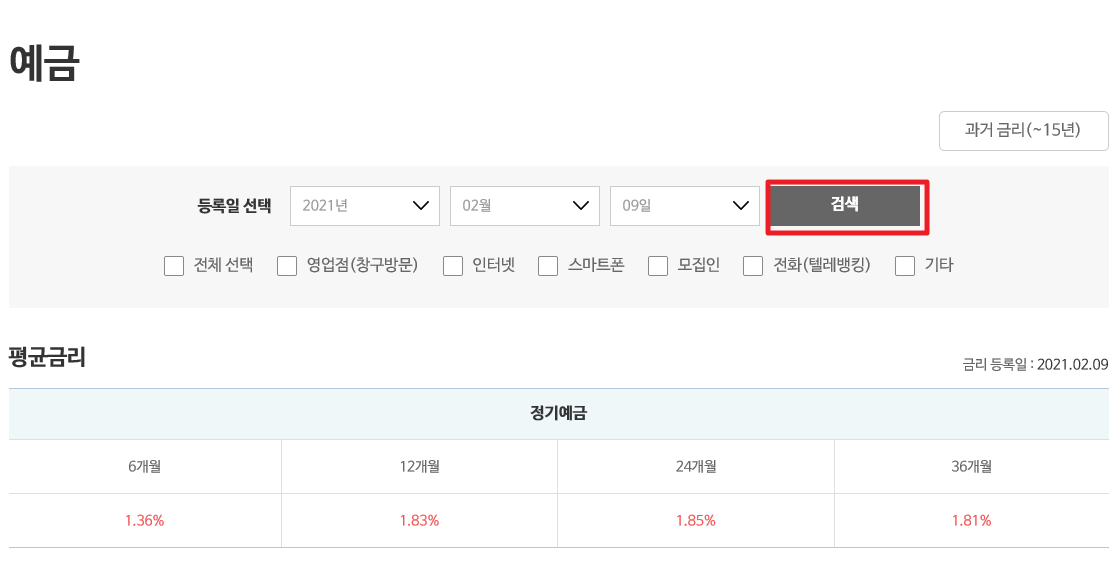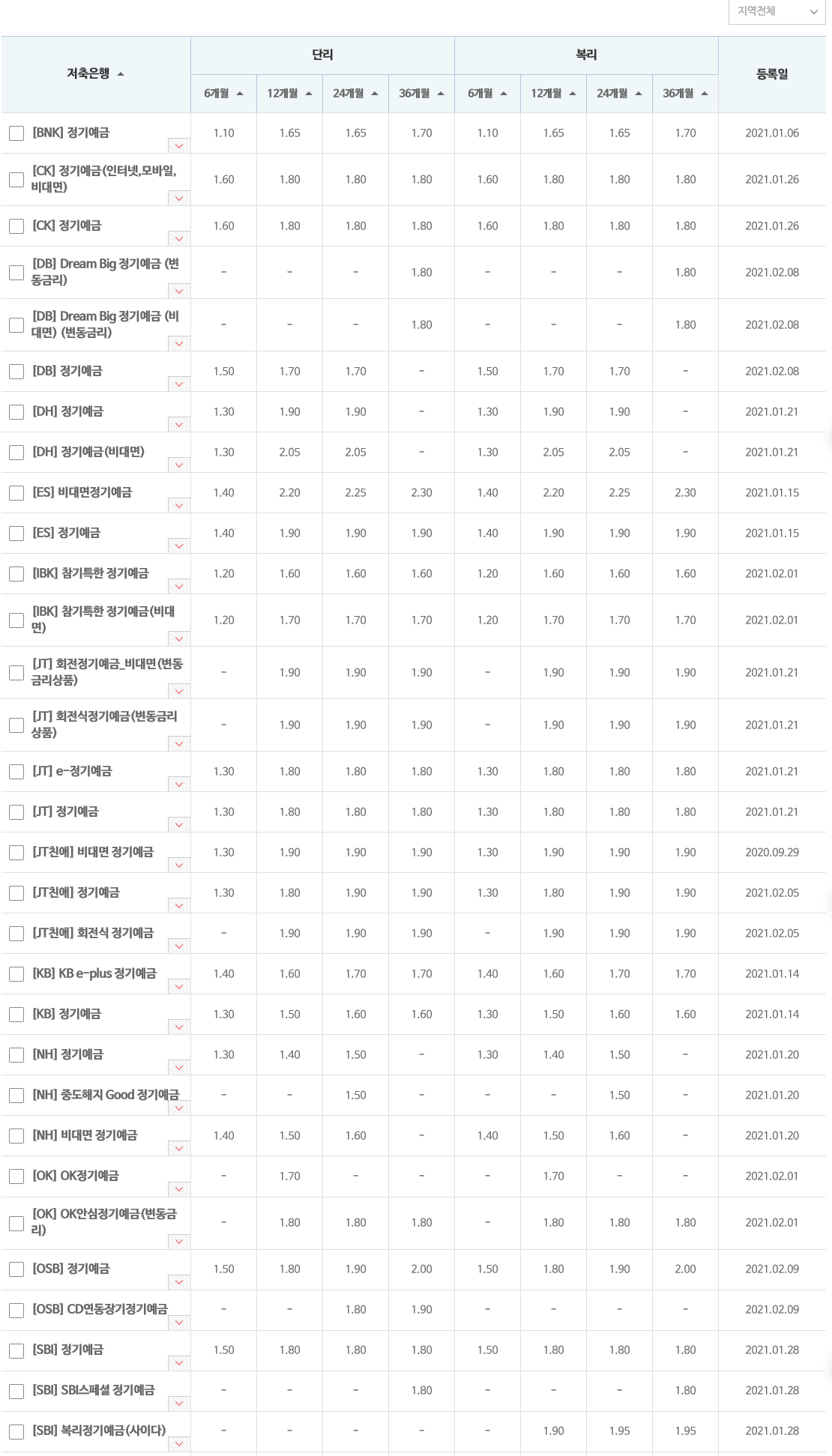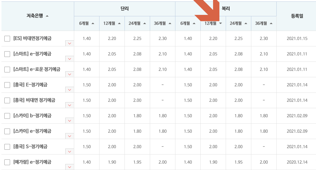 서울지역으로 하고, 화살표 처럼 그 기간을 마우스로 클릭하면 내림차순으로 해서 가장 높은 금리의 은행상품들을 보여준다.
