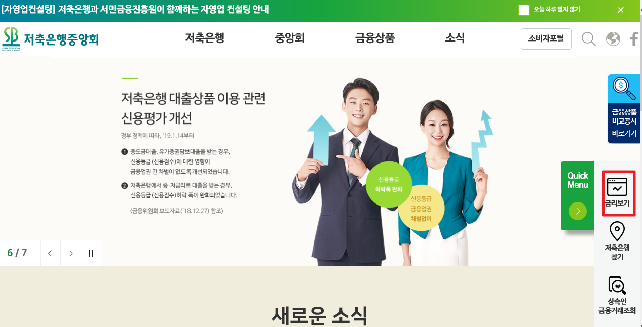 저축은행중앙회 홈페이지에 들어 갔으면, 우측 퀵 메뉴에 금리보기를 클릭한다.