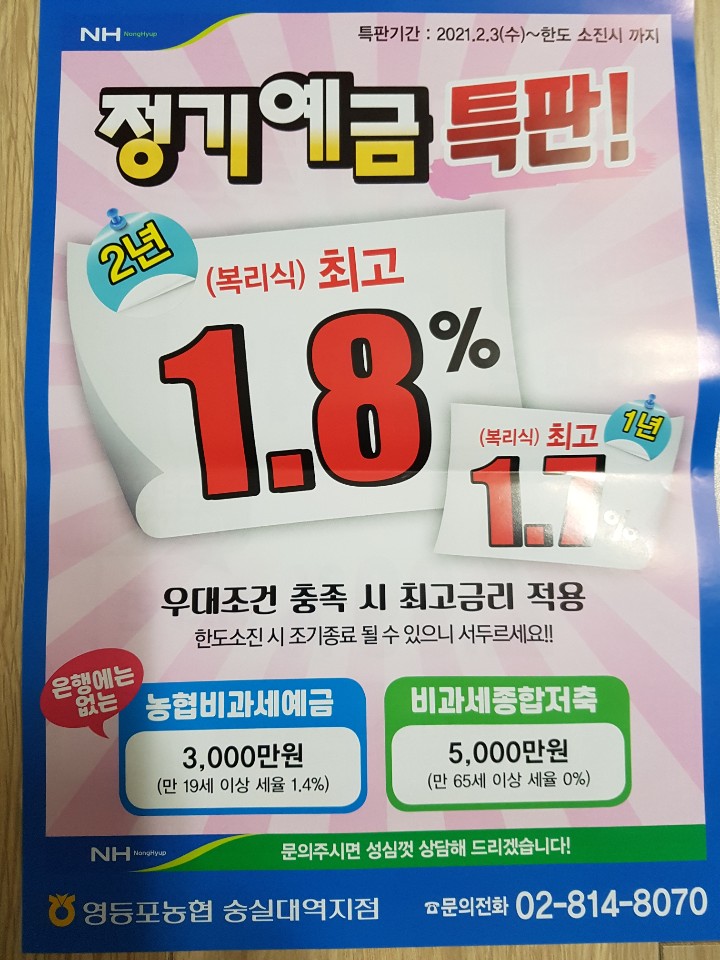 영등포농협 숭실대역지점의 정기예금특판 상품인데, 1년 복리식 최고 1.7%금리이고, 2년은 최고 1.8%금리이다.