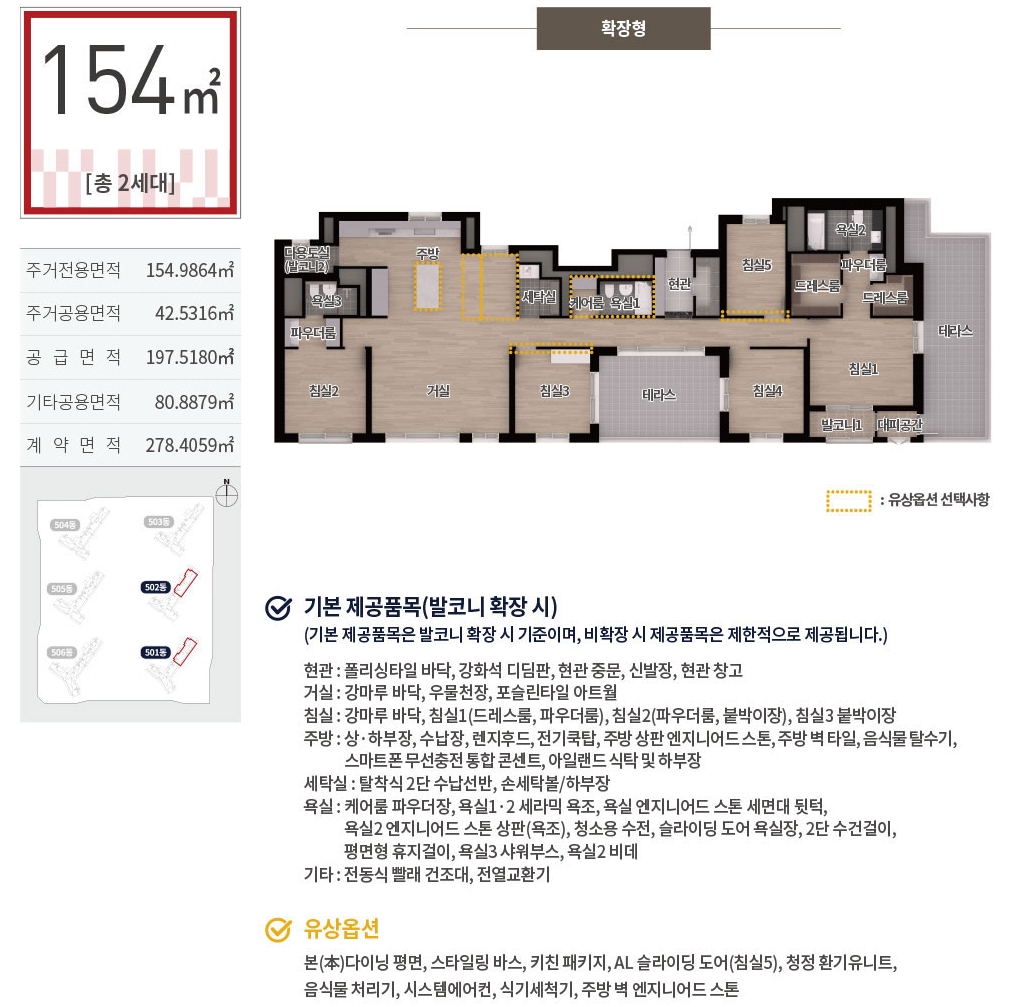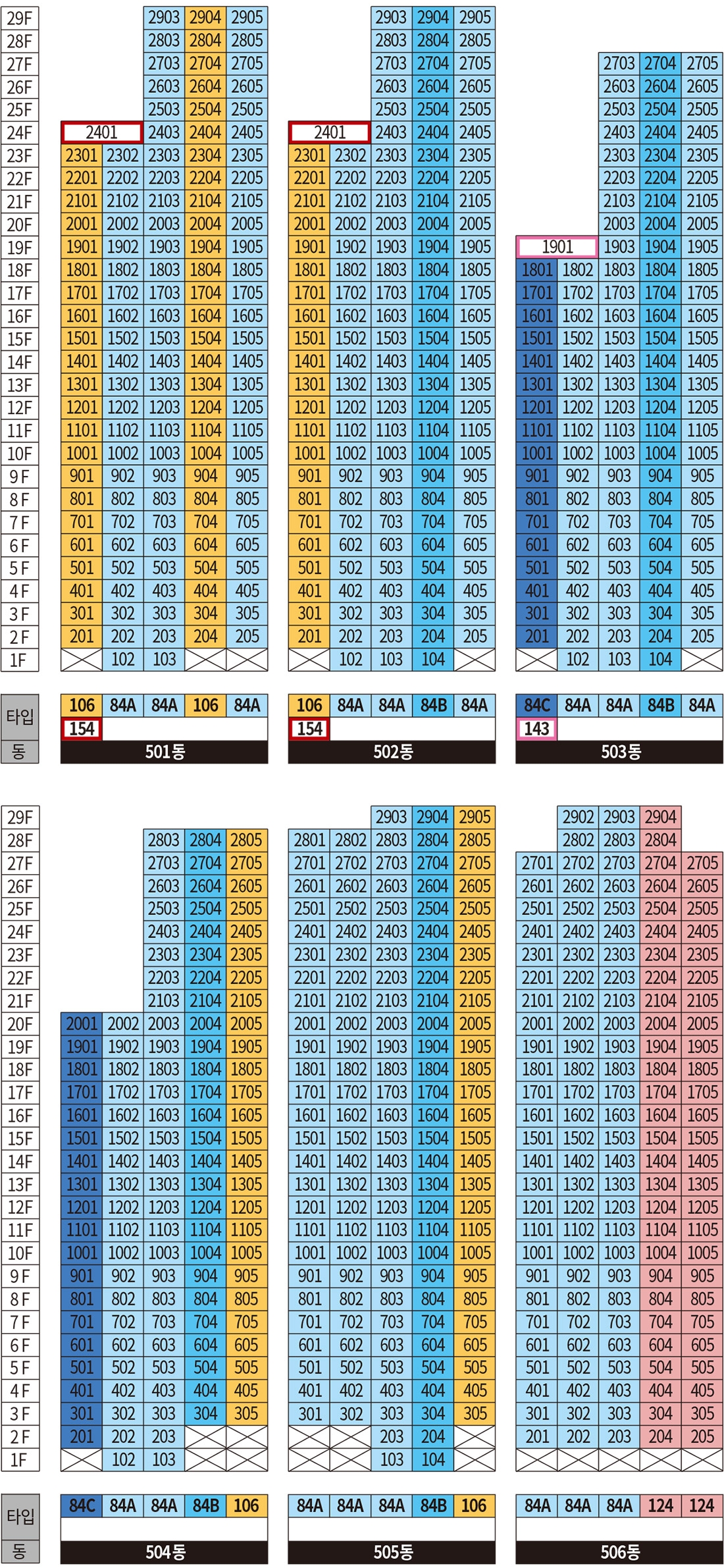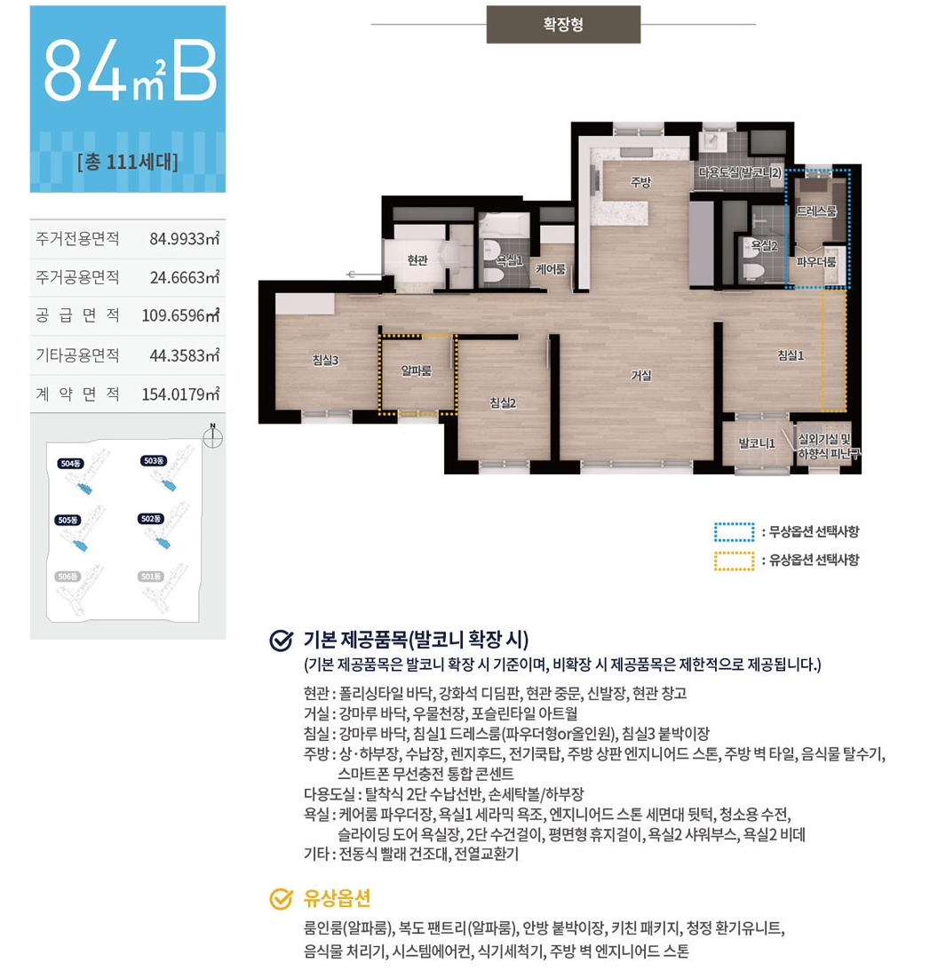 전용면적별로는 ▲84㎡A 442세대 ▲84㎡B 111세대 ▲84㎡C 36세대 ▲106㎡ 125세대 ▲124㎡ 54세대 ▲143㎡ 1세대 ▲154㎡ 2세대로 최근 수요자들의 선호도가 높은 전용면적 84㎡ 이상의 중대형 평형으로 구성됐다.