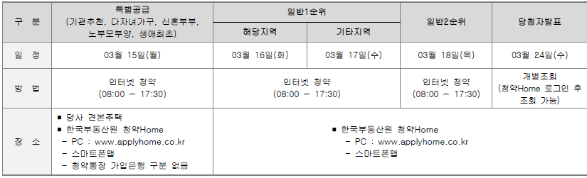 3월 15일 특별공급을 시작으로 3월 16일 해당지역 1순위, 3월 17일 기타지역 1순위, 3월 18일 2순위 청약접수를 받는다.