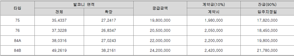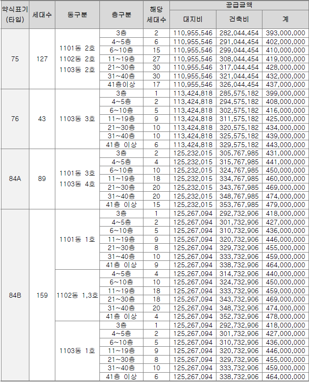 전용면적 별로는 75㎡ 127가구, 76㎡ 43가구, 84㎡A 89가구, 84㎡B 159가구 등으로 구성되었다.