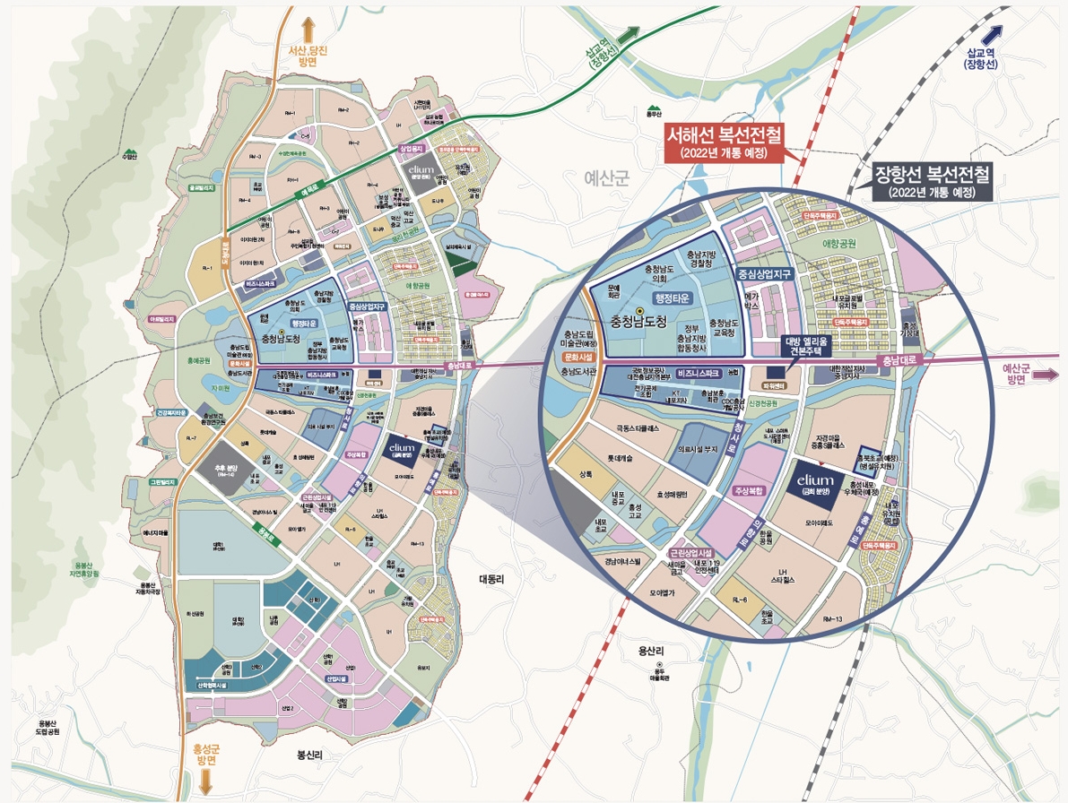 현재 충남도청, 충남교육청, 충남경찰청 등의 대규모 기관 및 단체가 입주해 있어 사전 기반 시설이 이미 갖춰진 상황이다. 내포신도시가 충남혁신도시로 지정돼 이곳에 종사하는 직장인 수요의 흡수 및 인근 중심상업지구 내 생활 편의시설의 손쉬운 이용이 예상돼 자족도시로서의 미래가치가 높다 할 수 있다.