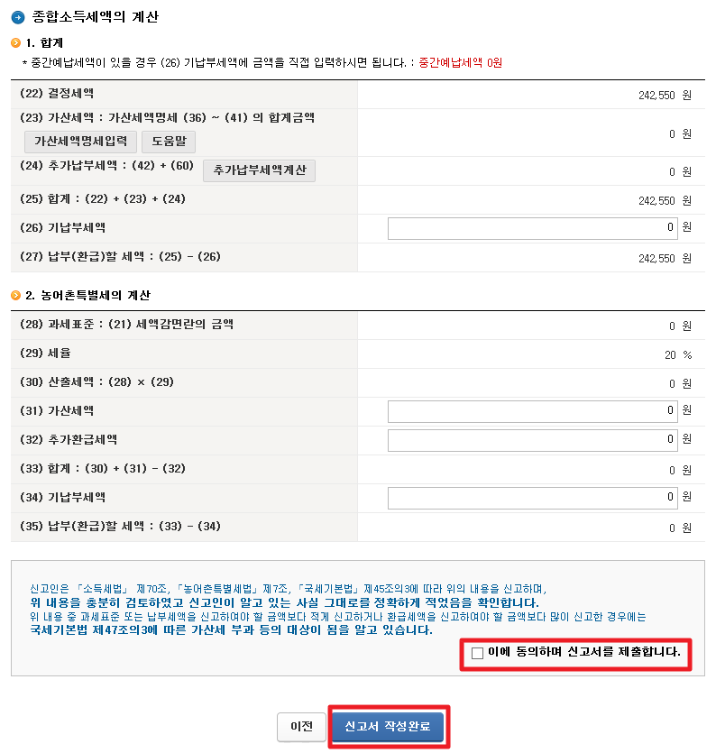 동의함에 체크하고 신고서를 제출합니다. 신고서 작성완료를 클릭하시면 됩니다.