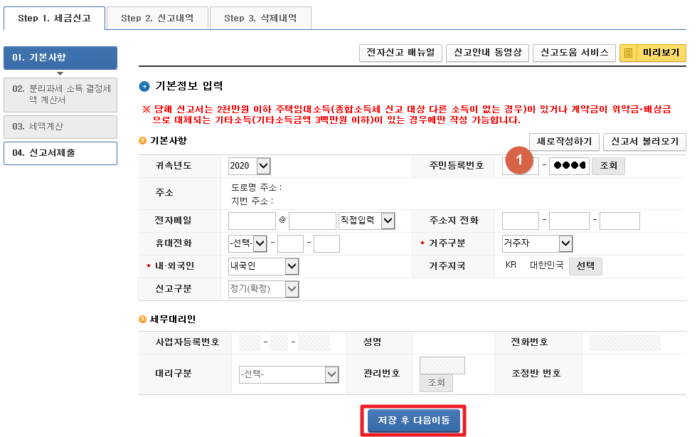 신고서(종합소득세 신고, 모두채움 신고 안내 주택임대소득) 작성화면으로 이동합니다.