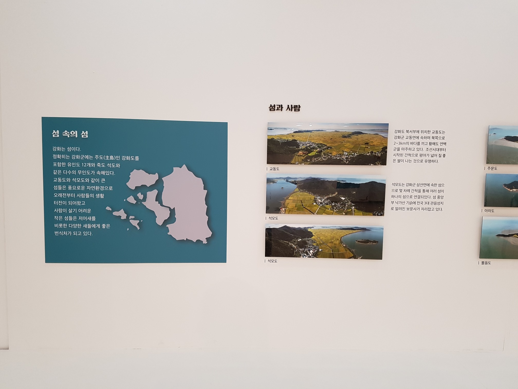 강화군에는 강화도인 주도를 포함해 여러개의 유인도와 무인도가 속해 있는 섬의 나라이다.