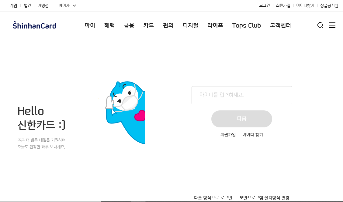 신한카드 홈페이지로 들어가서 로그인을 클릭하자.