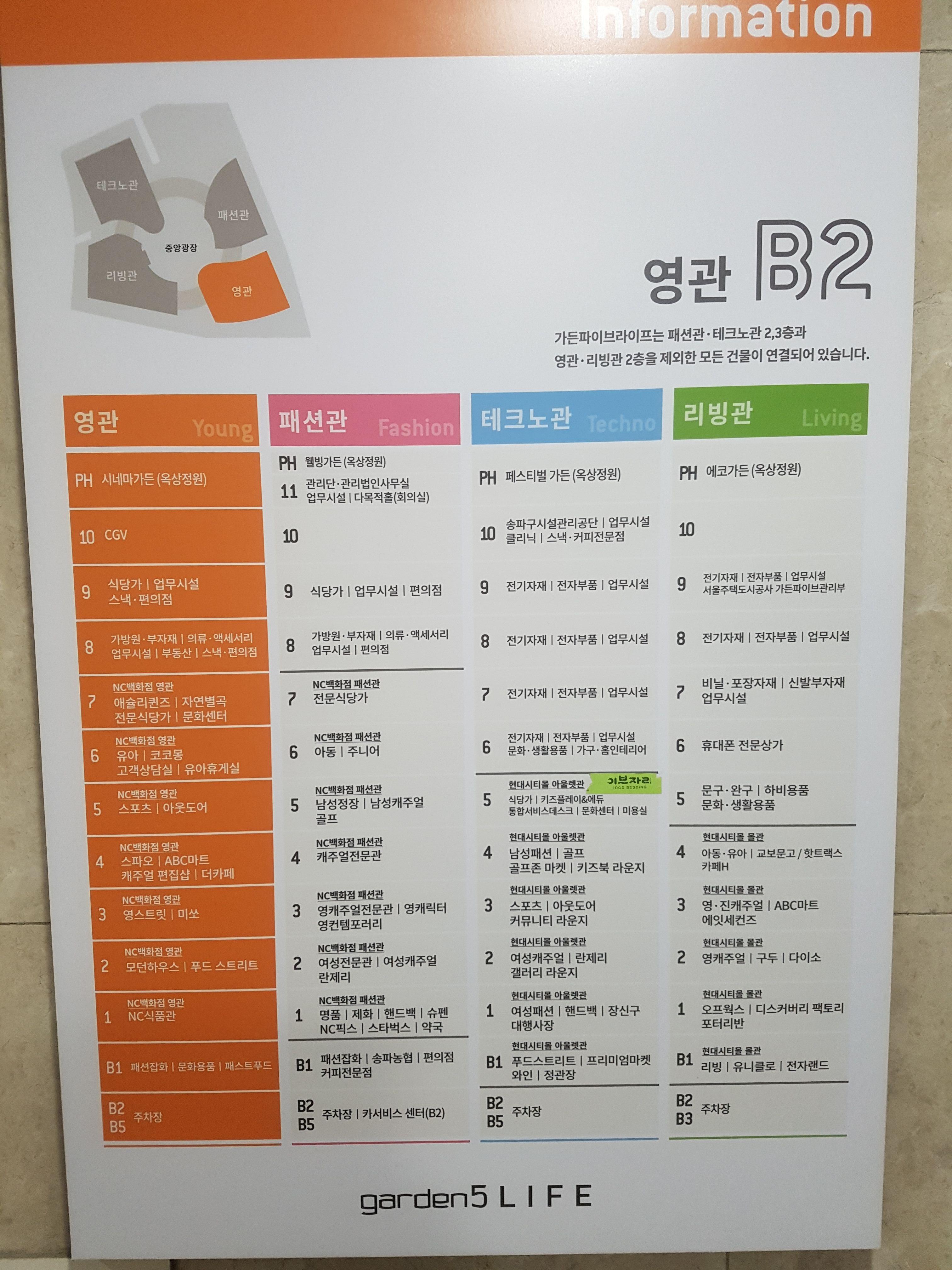가든파이브 라이프 몰로 총 4개관이 들어서 있는데, nc백화점 영관 7층이 전문 식당가이고, 애슐리퀸즈와 자연별곡 등이 입점해 있다.