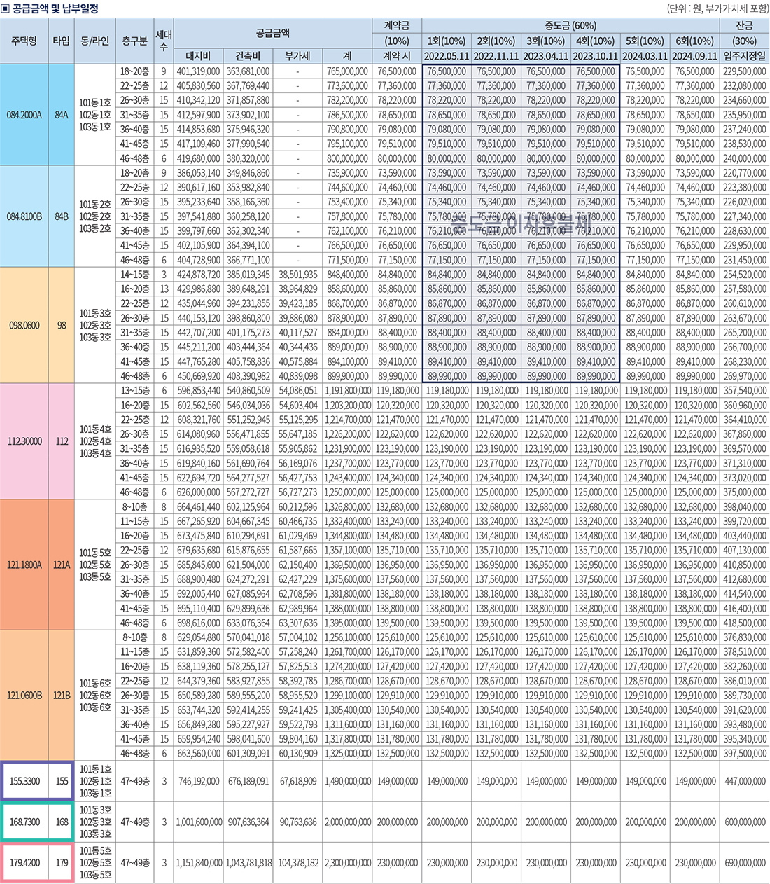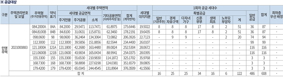 아파트 775세대 중 608세대가 일반분양되며 전용면적별 타입별로는 △84㎡ 174세대 △98㎡ 94세대 △112㎡ 99세대 △121㎡ 232세대 △155㎡ 3세대 △168㎡ 3세대 △179㎡ 3세대로 구성된다.