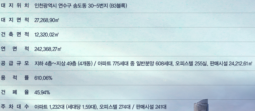 단지는 지하 4층∼지상 49층 4개 동 아파트 775세대, 오피스텔 255실 등 총 1030세대로 구성됩니다.