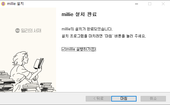 밀리 설치 완료 화면이 나오고, millie 실행하기 마침 버튼을 눌러 주면 실행된다.