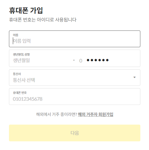 휴대폰 번호가 아이디로 사용되기에 휴대폰 가입을 해야 한다.