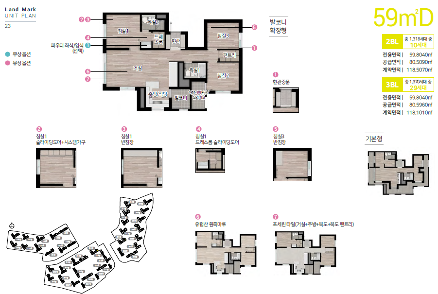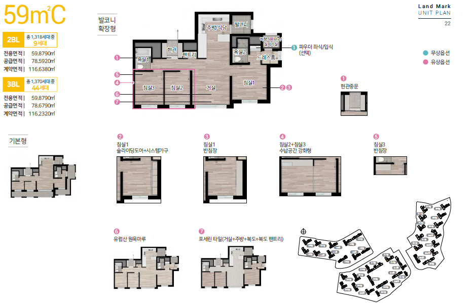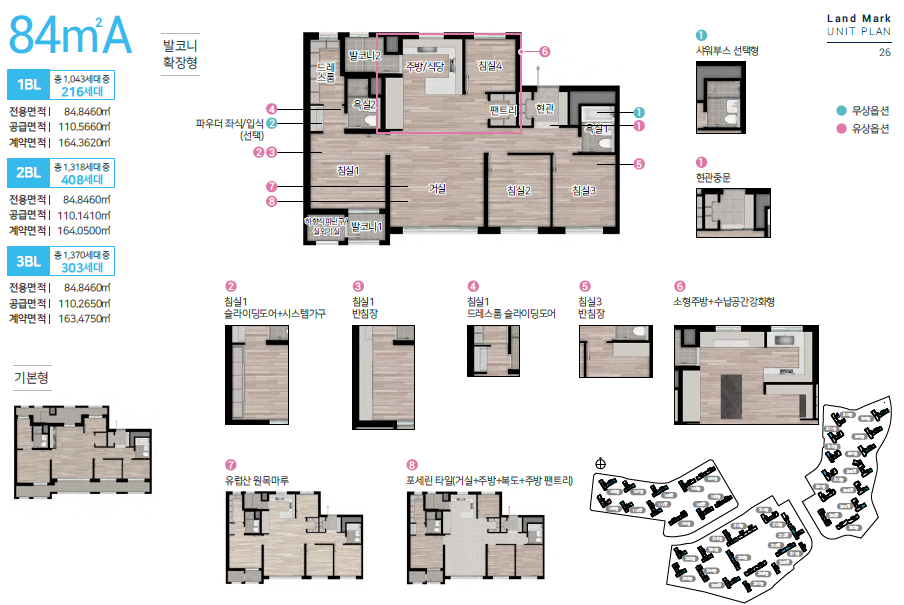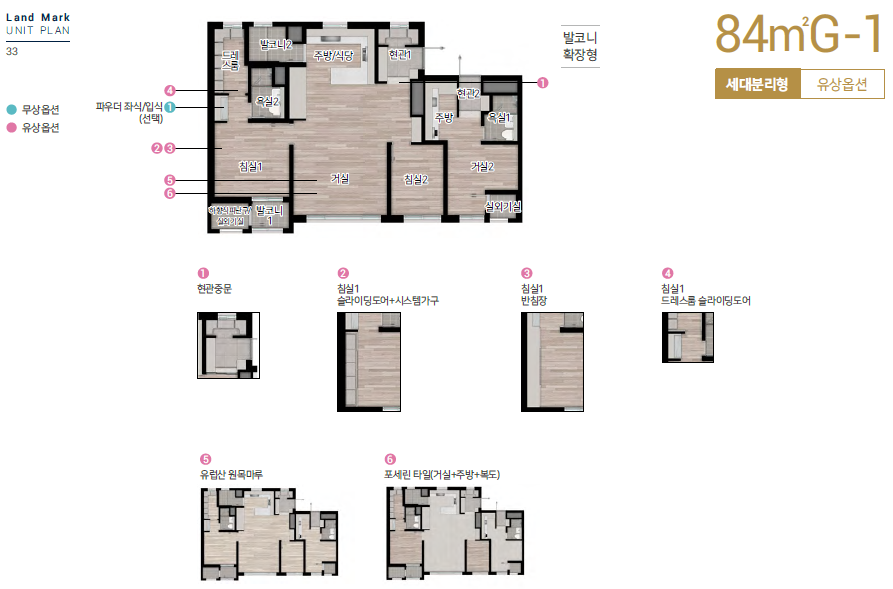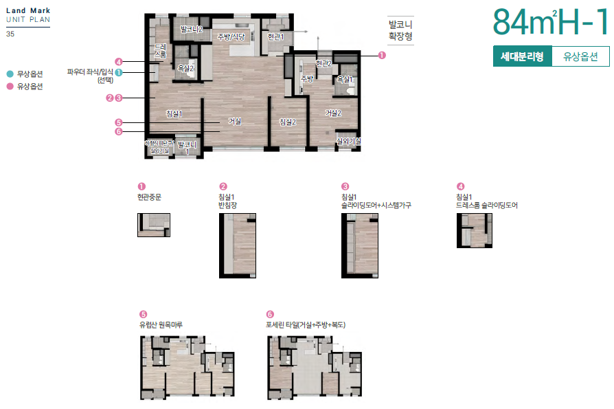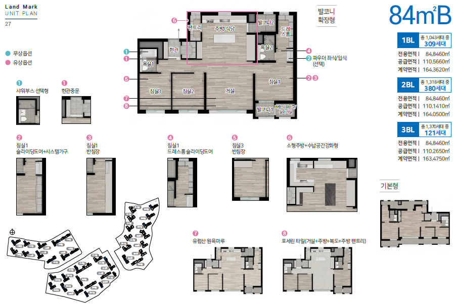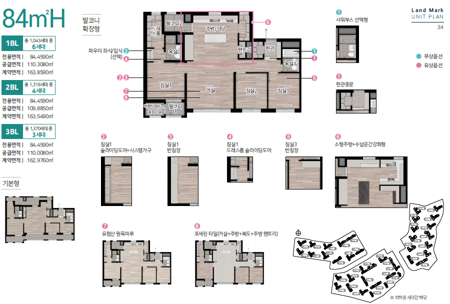빠르게 변하는 라이프스타일을 반영해 새롭게 개발된 평면선택제도 적용된다. 평면선택제를 통해 침실 2, 3을 수납공간 강화형으로 선택할 수 있으며, 주방 공간의 경우 최근 트렌드에 맞춰 주방은 작게, 다이닝 공간은 넓게 쓰는 ‘소형 주방+수납공간 강화형’ 옵션을 선택할 수 있다.