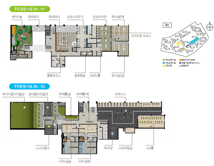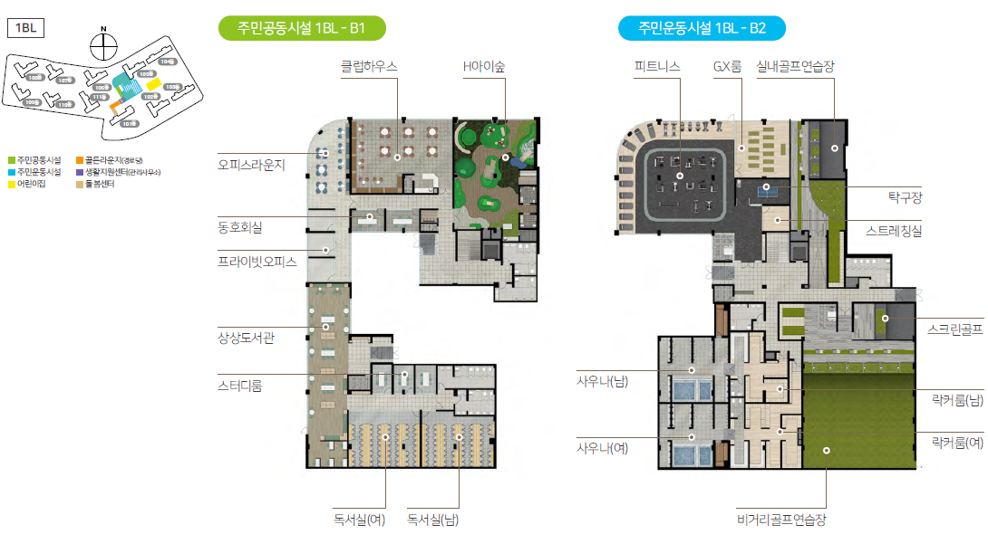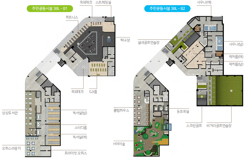 각 블록별로 실내 비거리골프장이 조성되며, 피트니스센터, 실내골프연습장, 사우나, 실내어린이놀이터, 상상도서관, 프라이빗 오피스, 게스트하우스 등이 설치될 예정이다.