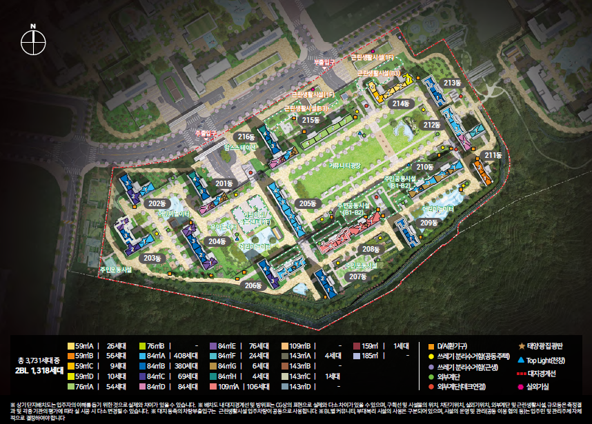 단지는 총 3개 블록에 지하 4층~지상 최고 29층 40개 동 전용면적 59~185㎡로 구성되고, 블록별로 1블록은 1043가구, 2블록은 1318가구, 3블록은 1370가구로 조성된다.