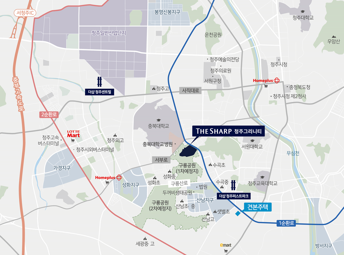 단지와 인접한 1순환로, 서부로 이용시 청주 전역으로 이동하기 용이하며 중부고속도로, 경부고속도로 등 광역 교통망도 탄탄하다.