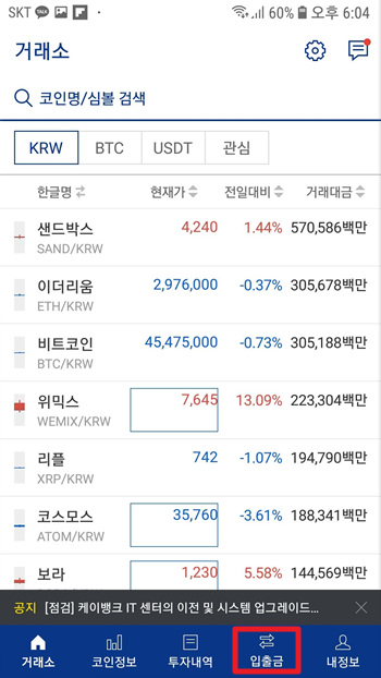 이번에 업비트로 로그인해서 입출금으로 들어가 보자.