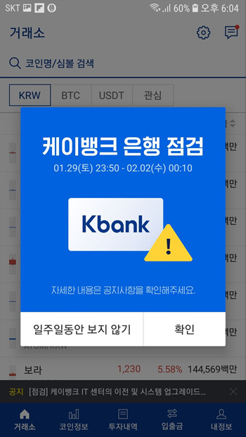 업비트는 케이뱅크를 주거래은행으로 하기에 29일 토요일 밤부터 IT센터 옮긴다고 하니 원화 입출금이 안된다고 한다. 설까지 시스템 업그레이드가 이뤄지니 돈을 인출하려면 토요일 오후까지는 빨리 인출하길 바란다.