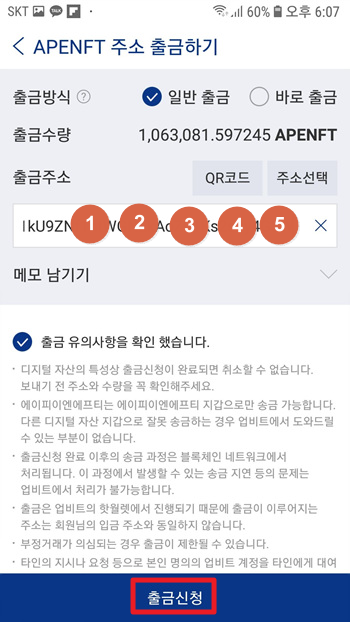 업비트에 있는 에이피이엔에프티를 빗썸으로 가져오기 위해선, 빗썸에서 입금주소를 생성하고, 업비트에서 그 주소로 출금하기만 하면 OK다.