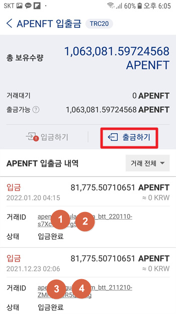 에이피이엔에프티입출금 화면이 나온다.