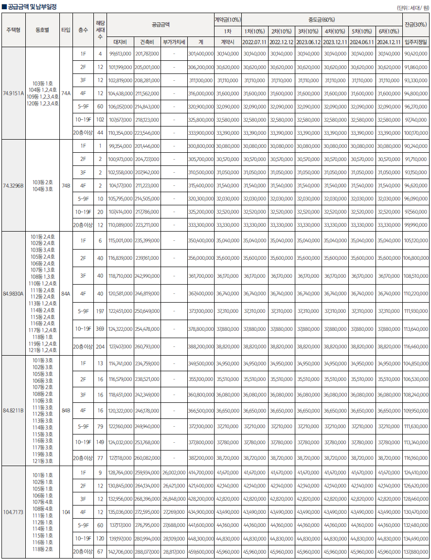 전용면적별 타입별로 ▲74㎡A 246가구 ▲74㎡B 49가구 ▲84㎡A 896가구 ▲84㎡B 366가구 ▲104㎡ 292가구 등이다.