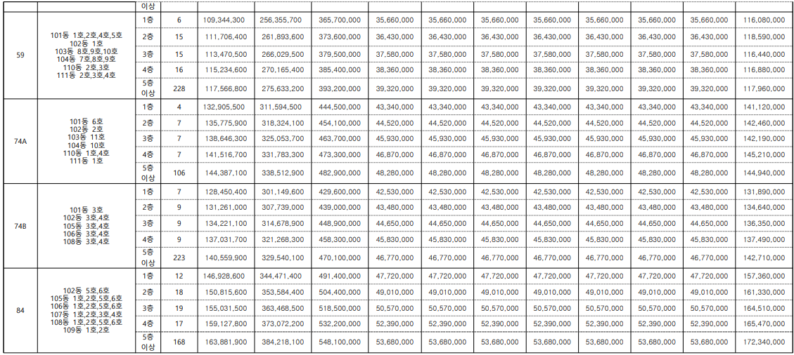 이 중 1017가구를 일반분양하며, 전용면적별 가구수는 △39㎡ 18가구 △49㎡ 97가구 △59㎡ 280가구 △74㎡A 131가구 △74㎡B 257가구 △84㎡ 234가구로 구성된다.