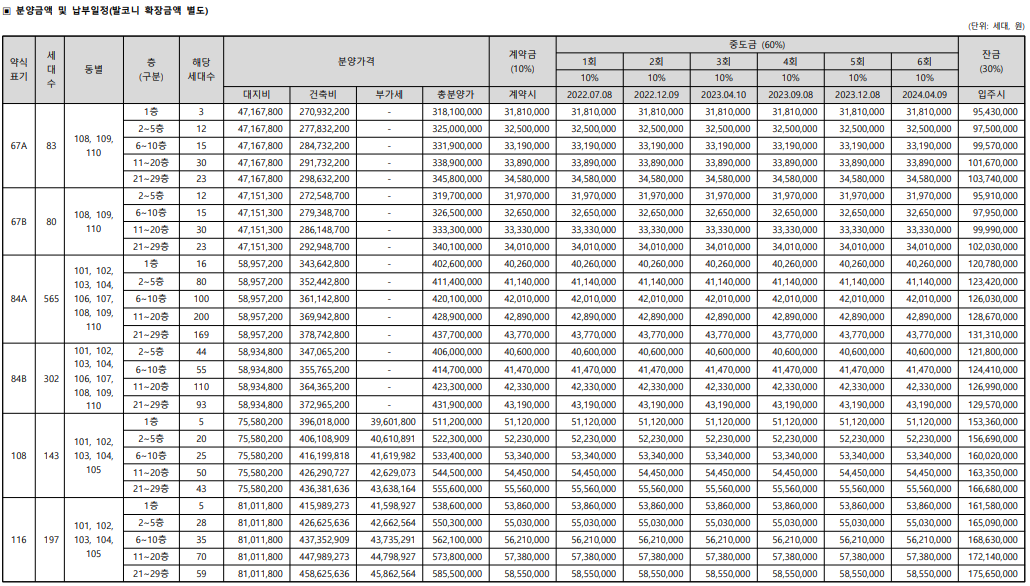 단지는 지하 2층~지상 29층, 10개 동 총 1370가구 규모로 조성되며, 전용면적별로는 △67㎡A 83가구 △67㎡B 80가구 △84㎡A 565가구 △84㎡B 302가구 △108㎡ 143가구 △116㎡ 197가구로 구성된다.