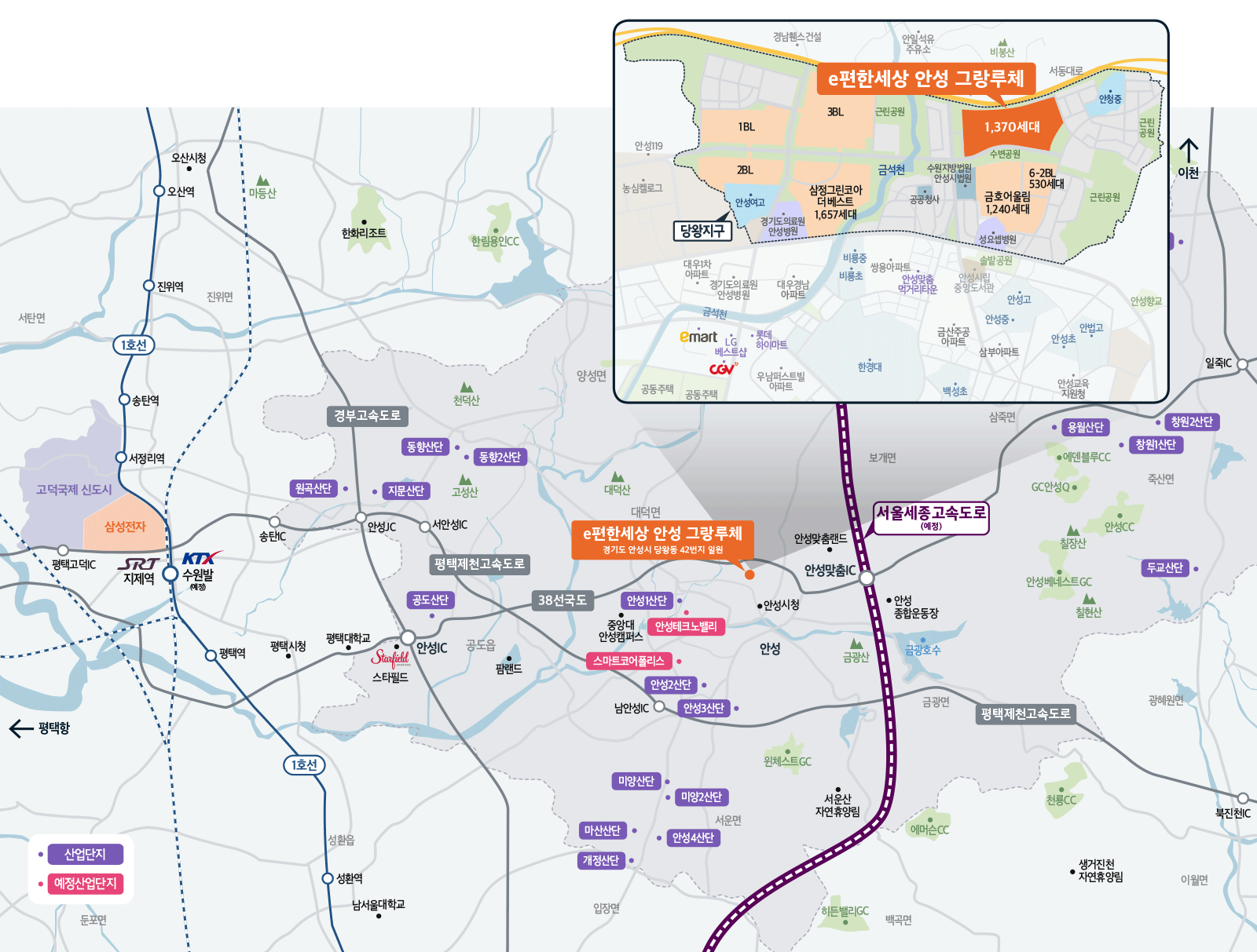 38번 국도로 평택권역은 물론 SRT평택지제역 접근도 용이하다. 경부고속도로와 평택제천고속도로 이용도 쉽고, 올해 서울세종고속도로 구리~안성 구간 개통시 서울까지 1시간이면 이동이 가능할 전망이다.
