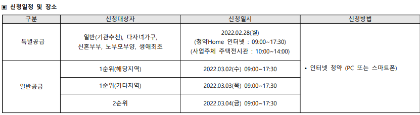 2월 28일 특별공급을 시작으로 3월 2일(수) 1순위 해당지역, 3일 1순위 기타지역, 4일 2순위 청약 접수가 예정돼 있다. 한국부동산원 청약홈 홈페이지에서 청약 가능하며, 당첨자 발표일은 11일 예정이다.