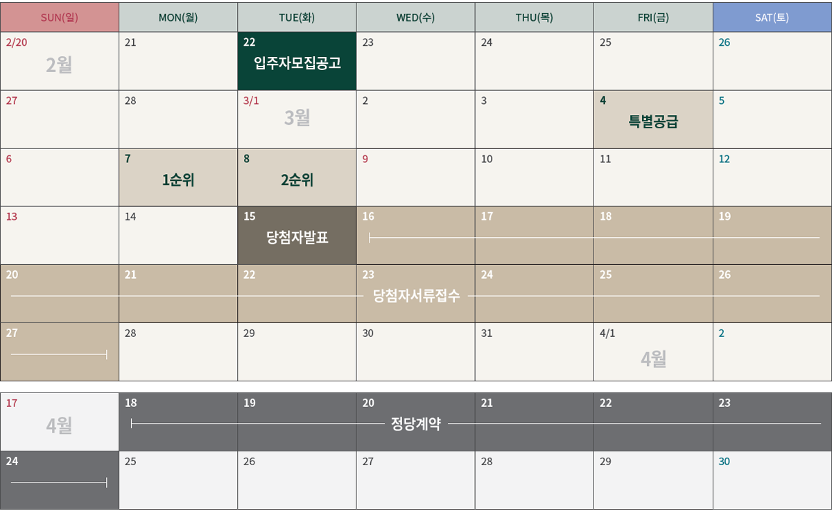 공공분양은 한국부동산원 청약홈에서 3월4일 특별공급 접수를 시작으로 7일 1순위, 8일 2순위 청약 접수를 한다. 15일 당첨자를 발표한다.