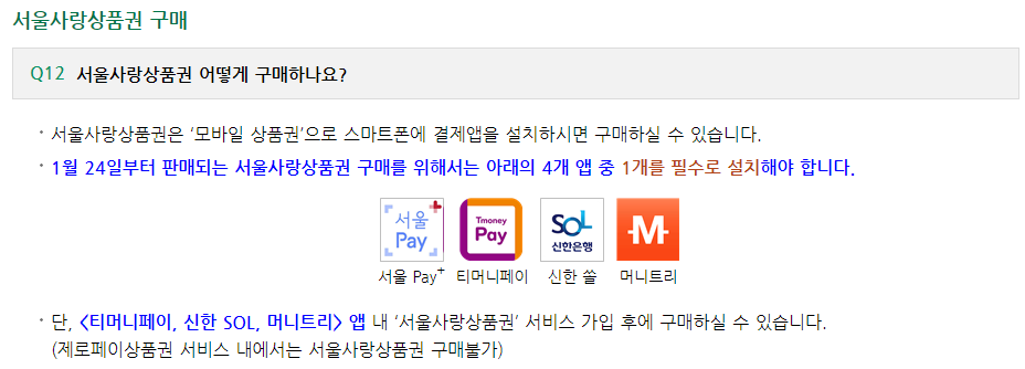 서울사랑상품권 구매를 위해서는 서울 Pay+, 티머니페이, 신한sol, 머니트리 앱 중 1개를 필수로 설치해서 구매할 수 있답니다.