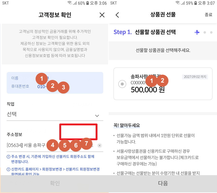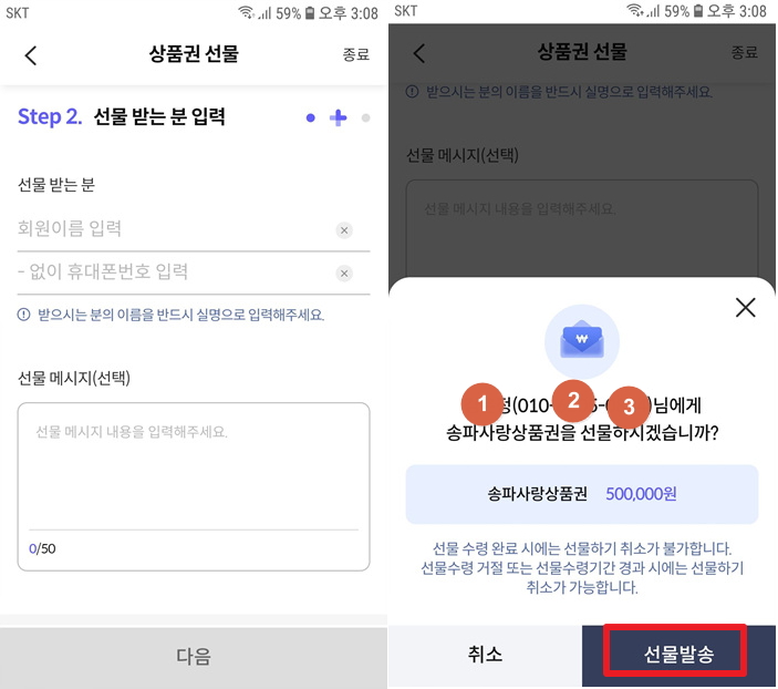 선물 받는 분의 회원이름과 휴대폰번호를 정확하게 입력한 후 다음을 클릭합니다.