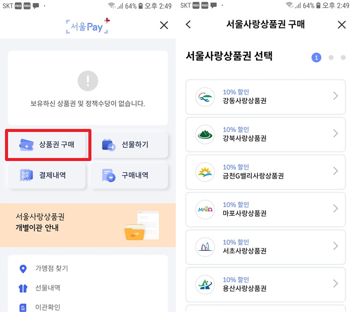 서울페이플러스에서 상품권 구매를 클릭합니다.