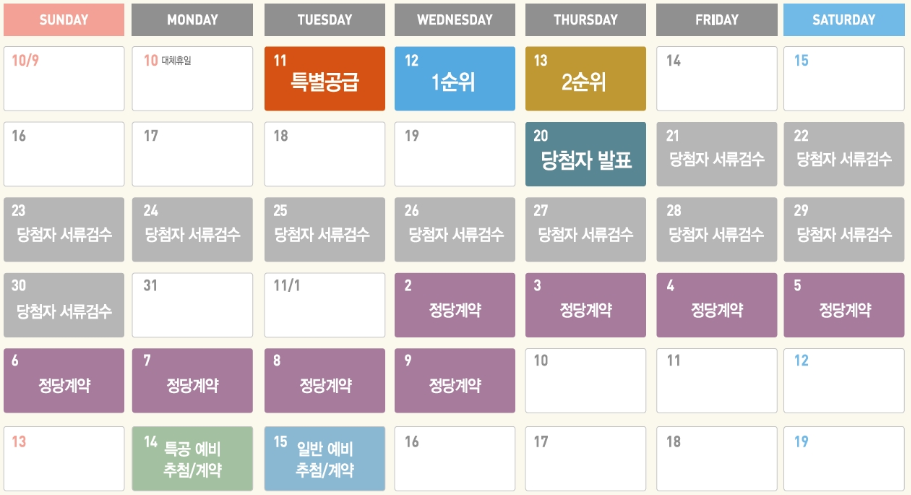 10월11일 특별공급을 시작으로 12일 1순위를 진행한다. 당첨자 발표는 10월20일이며, 정당계약은 11월2일부터 9일까지다.