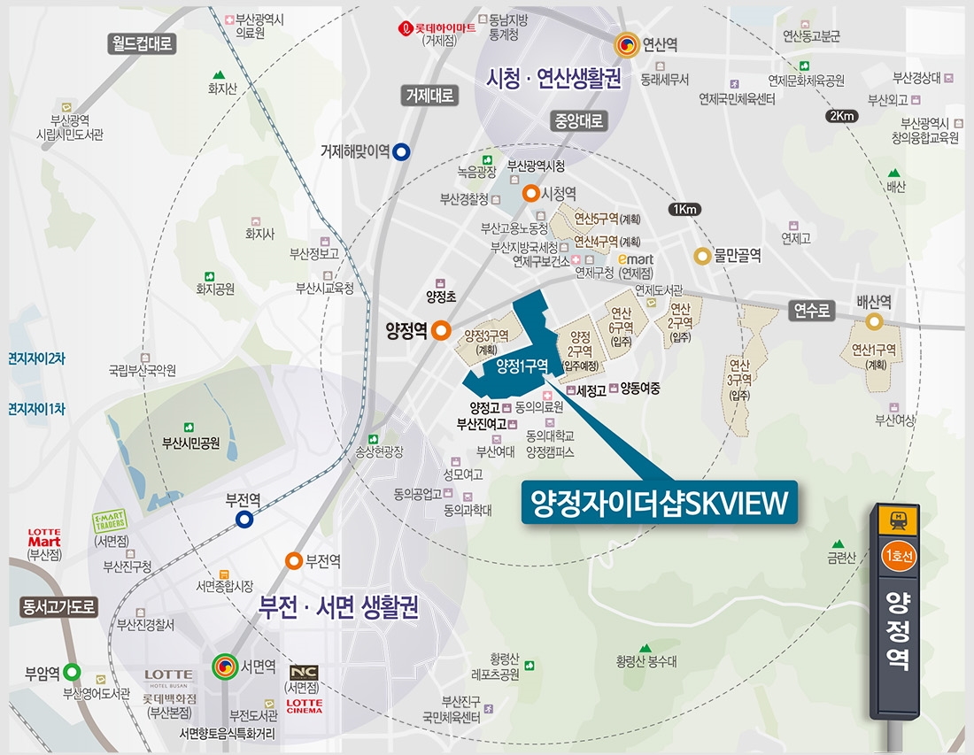 단지가 들어서는 양정동은 반경 1km이내에 부산시청, 경찰청, 시의회, 부산국세청, 연제구청 등 행정타운이 밀집해 있고, 이마트 및 롯데백화점, 연산시장, 부산 최대 다이소 매장을 걸어서 이용할 수 있는 인프라를 자랑한다.