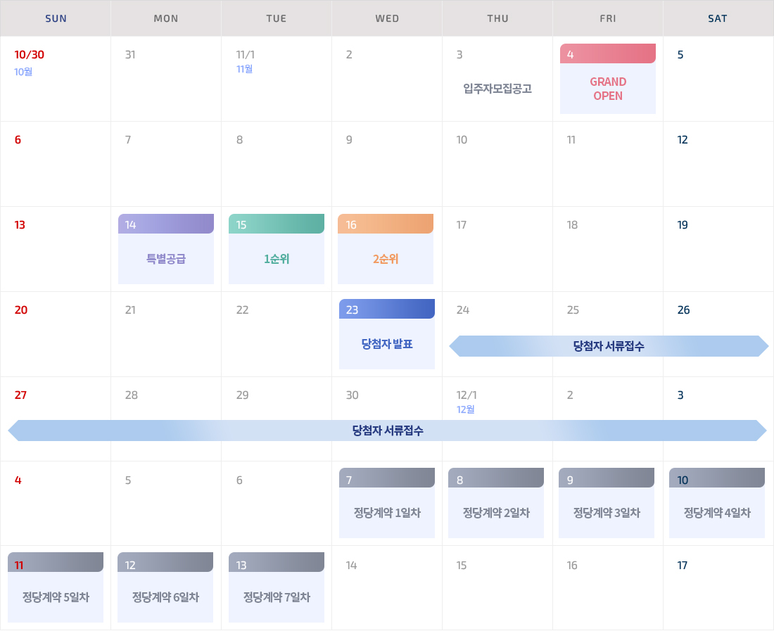 11월 14일 특별공급을 시작으로 15일 1순위 청약, 16일 2순위 청약 접수를 실시한다. 당첨자는 23일 발표하며, 정당 계약은 12월 7일에서 13일까지 7일간 진행하는 청약일정이다.