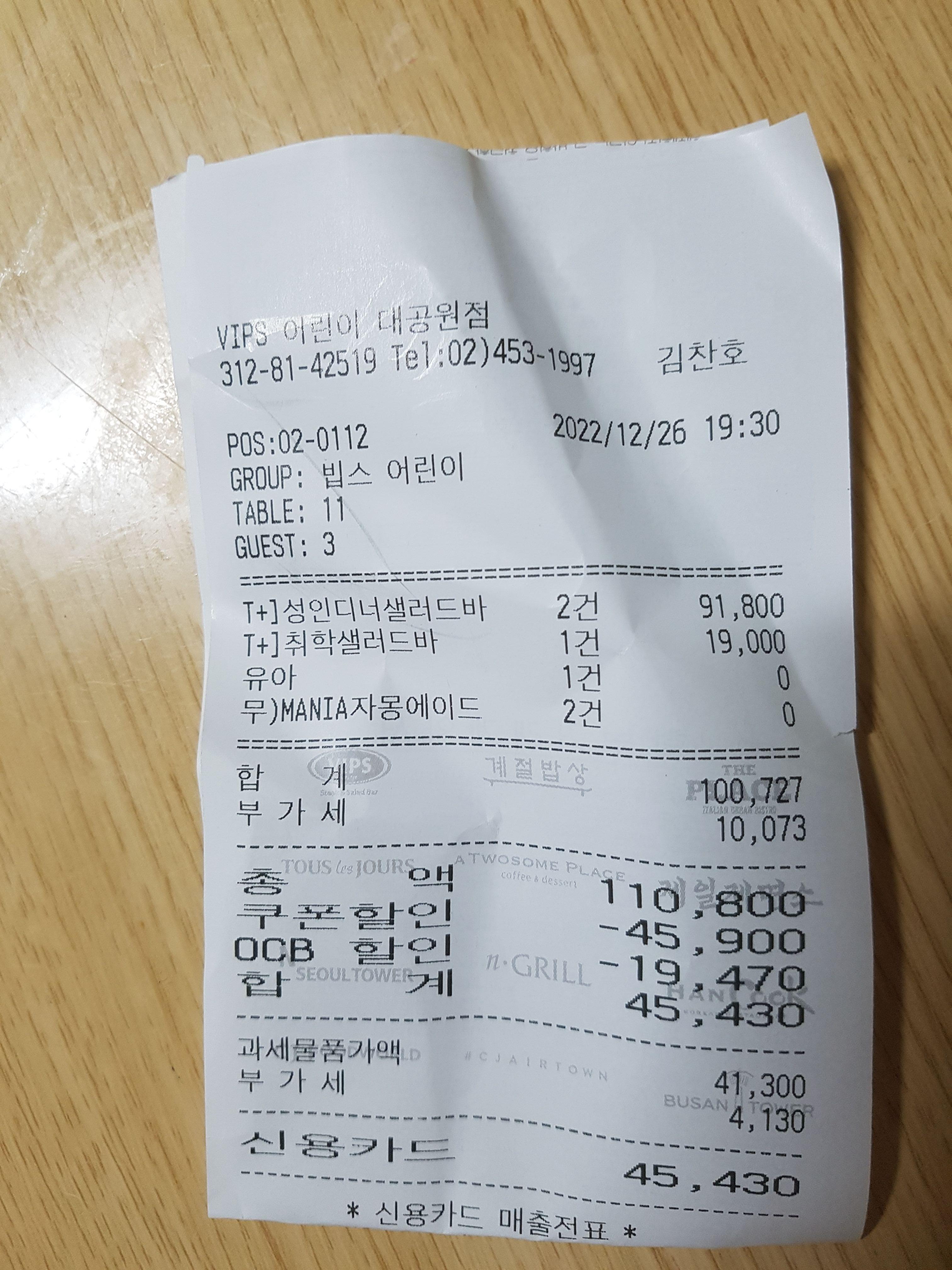 빕스 평일 저녁이 성인 45,900원인데, 1+1 쿠폰 적용으로 할인 받아서 위와 같이 나왔다는 거~!