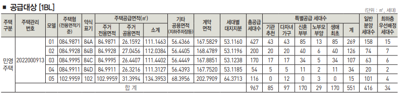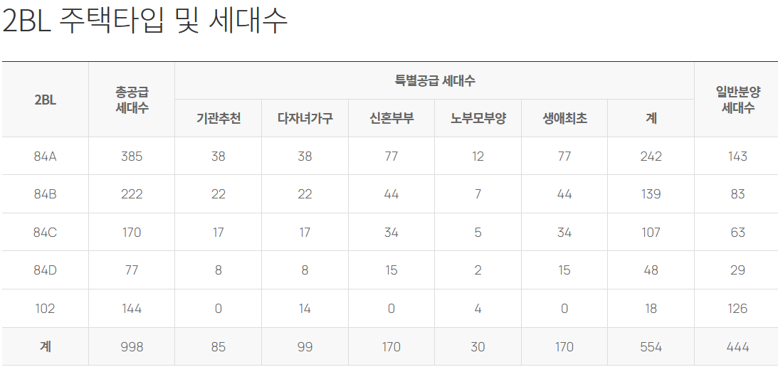 - 2블록 주택형별 계약면적 및 공급세대수 안내