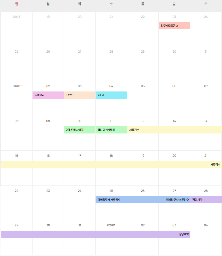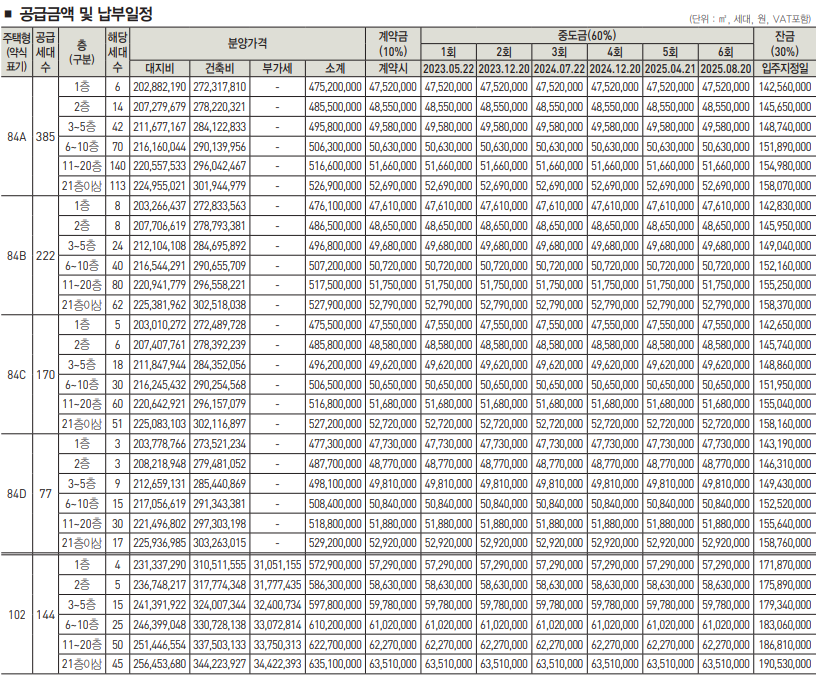1월 2일 특별공급을 시작으로 3일 1순위, 4일 2순위 청약을 받는다. 당첨자는 10일(2블록), 11일(1블록) 이틀간 발표하며 정당계약은 28일부터 다음달 3일까지 7일간 진행된다. 입주는 2026년 5월 예정이다.