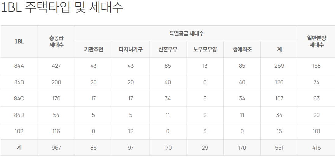 타입별 일반분양 가구 수는 1블록 ▲84㎡A 427가구 ▲84㎡B 200가구 ▲84㎡C 170가구 ▲84㎡D 54가구 ▲102㎡ 116가구 등 967가구며 2블록은 ▲84㎡A 385가구 ▲84㎡B 222가구 ▲84㎡C 170가구 ▲84㎡D 77가구 ▲102㎡ 144가구 등 998가구다.