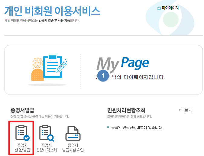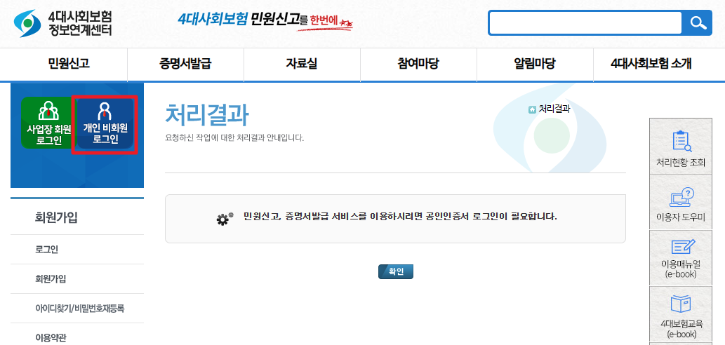 민원을 신청하려면 개인 비회원 로그인을 해야 한다.