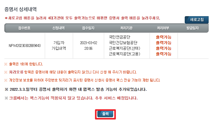 증명서 상세내역에 새로고침을 눌러줘야 출력기능으로 바뀌게 된다.