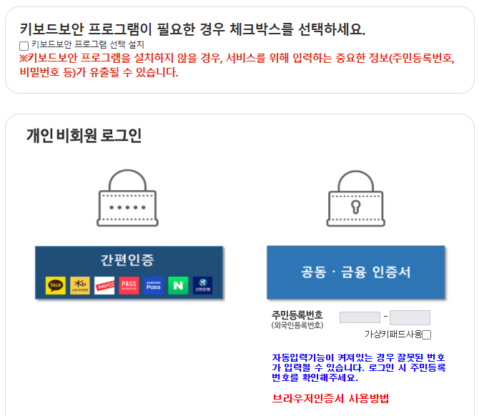 간편인증이나 공동 금융 인증서 로그인이 가능한다.