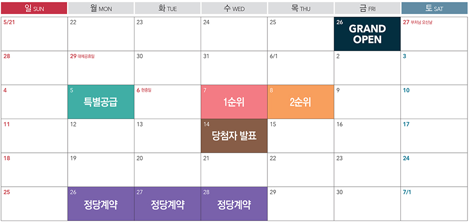 6월 5일 특별공급, 7일 1순위, 8일 2순위 청약 순으로 진행된다. 당첨자 발표일은 14일이다. 정당계약은 26일부터 28일까지다.