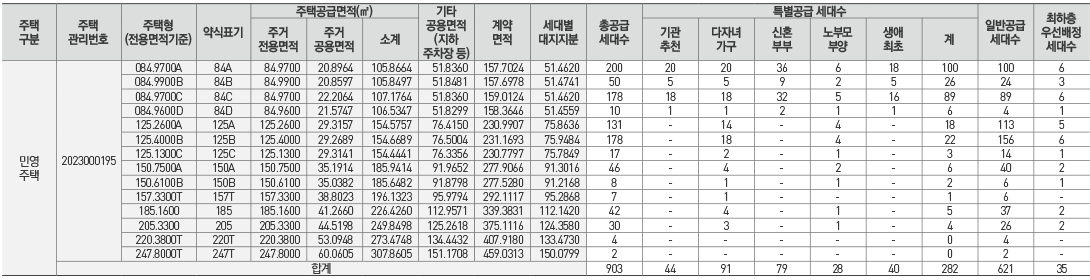 주택형별 계약면적 및 공급 세대수