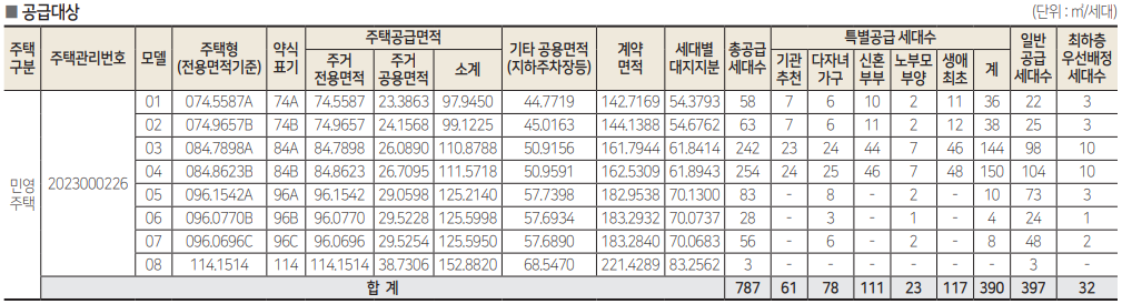 - 주택형별 계약면적 및 공급세대수 안내