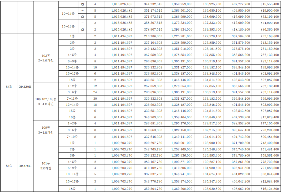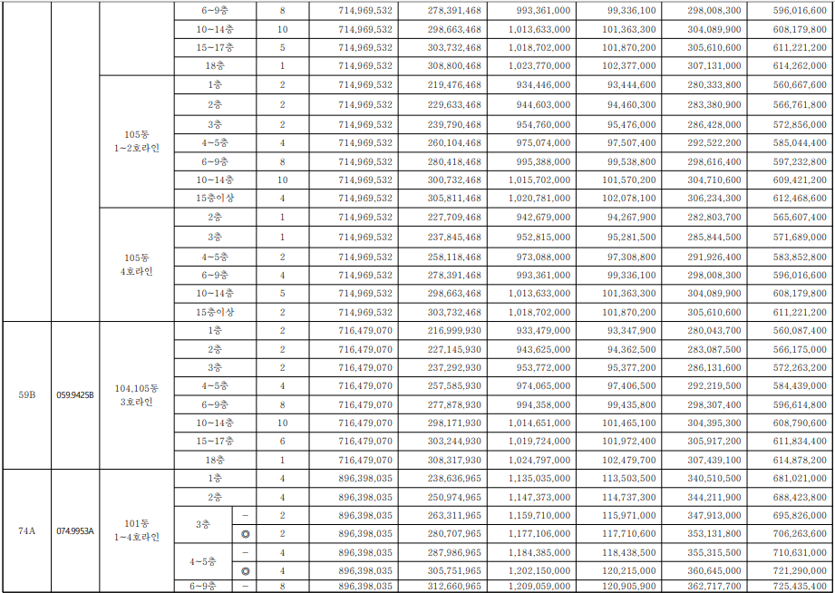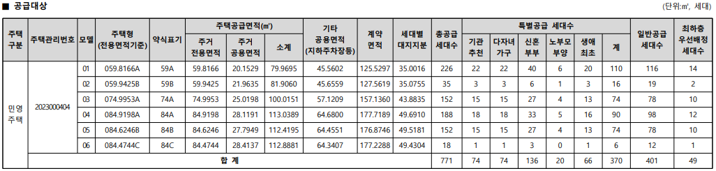 일반분양 물량을 전용면적별로 살펴보면 ▷59㎡A 226가구 ▷59㎡B 35가구 ▷74㎡A 152가구 ▷84㎡A 188가구 ▷84㎡B 152가구 ▷84㎡C 18가구 등 다양한 주택형으로 구성된다.