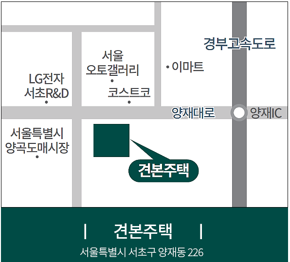 견본주택의 위치는 서초구 양재동 226번지 오토갤러리 맞은편에 위치하고 있습니다.