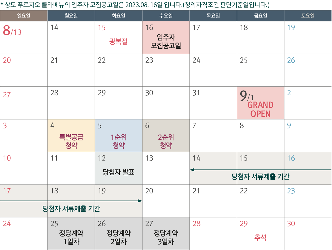9월 1일에 모델하우스 오픈을 시작으로 9월 4일 특별공급, 5일 1순위 청약, 6일 2순위 청약을 받을 예정입니다.