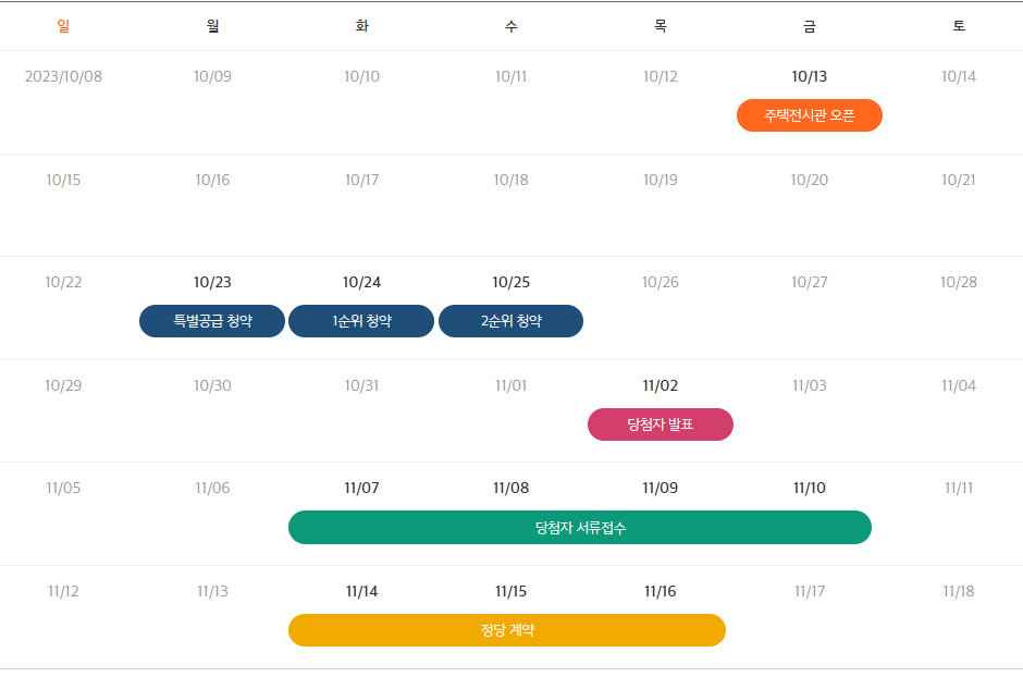 10월 23일 특별공급, 24일 1순위, 25일 2순위 청약접수를 받는다. 당첨자 발표는 내달 2일, 정당계약은 14~16일까지 3일 간 진행된다.